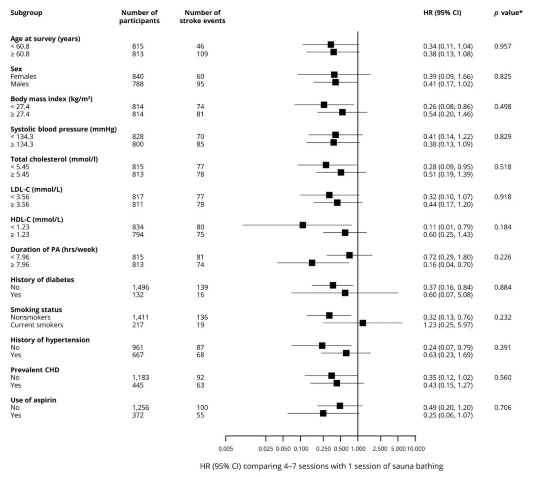 進一個步驟剖析發明,在斟酌瞭性別、年紀原因之後,每周洗4-7次桑拿與卒中風險下降的關系仍然慎密(HR 0.39,95%CI 0.18-0.83,p=0.014);而進一個步驟參加BM Meeting-girlI、抽煙喝酒、血壓、低密度脂卵白(LDL-c)、2型糖尿病以及藥物醫治等一系列的血汗管相干風險原因之後,每周洗4-7次桑拿仍然可以或許顯明下降卒中風險(HR 0.39,9 Asugardating 5%CI 0.18-0.84,p=0.016);活動或社會經濟狀態也不會影響成果(HR 0.38,95%CI 0.18-0.81,p=0.013)。